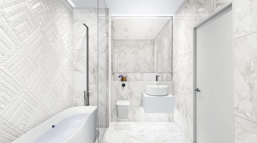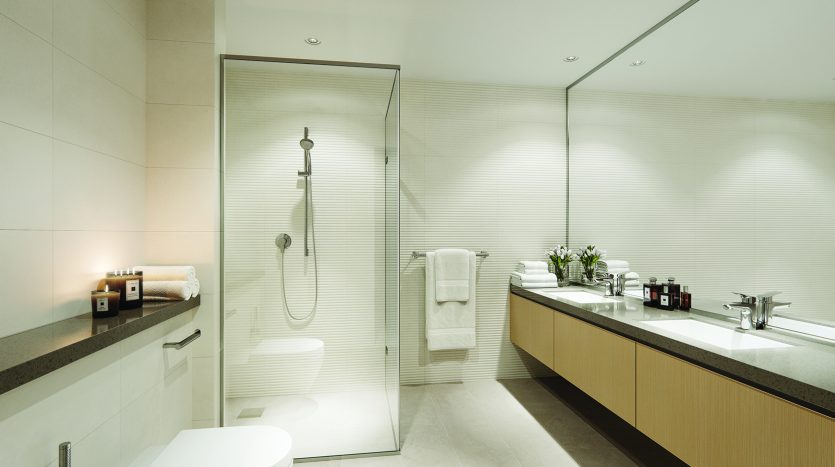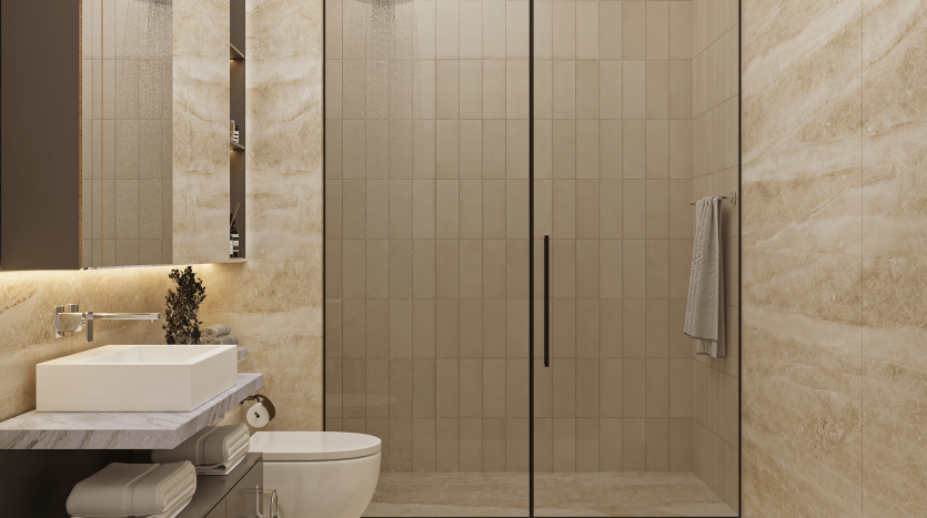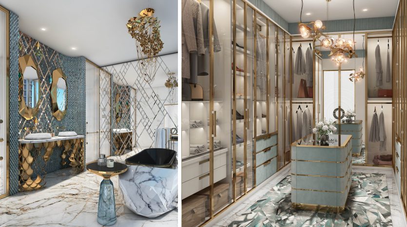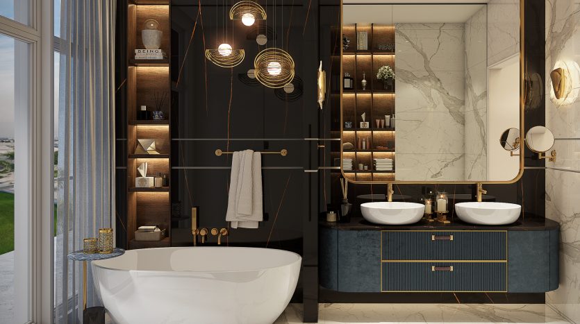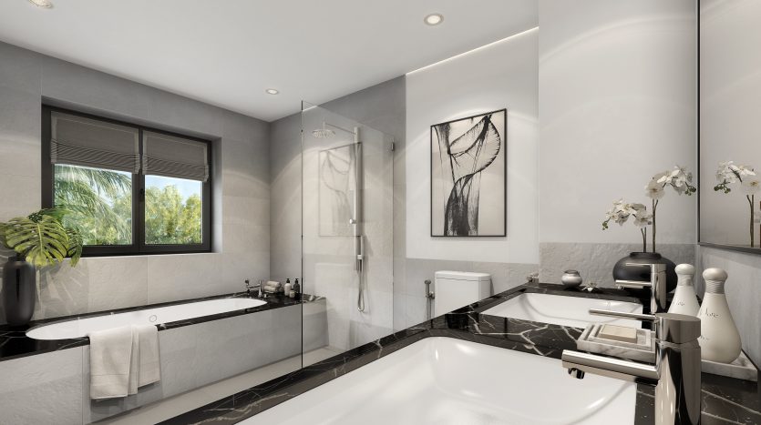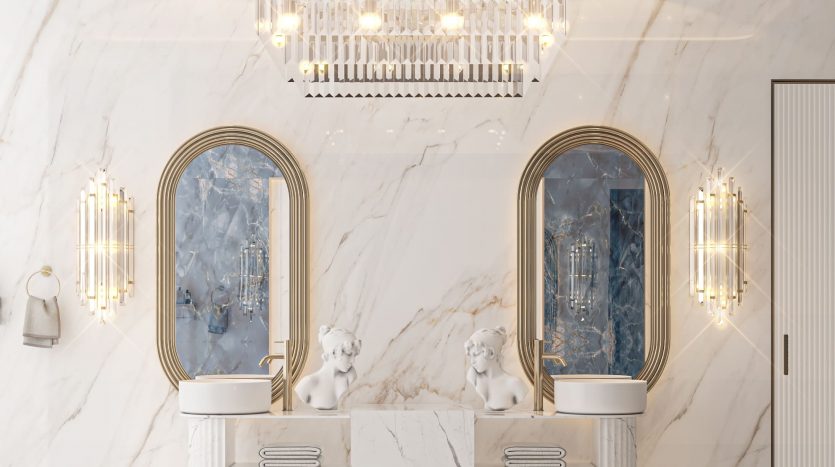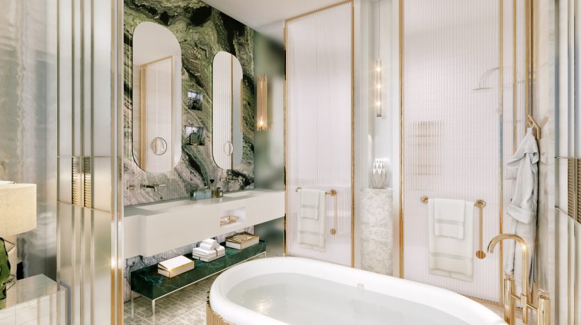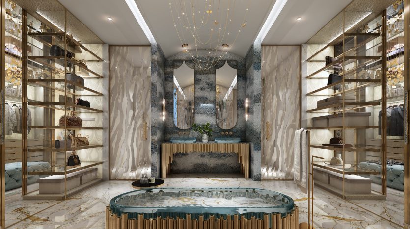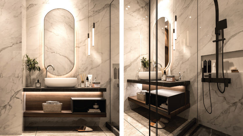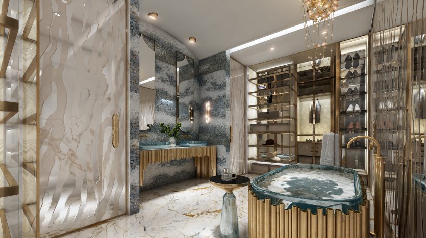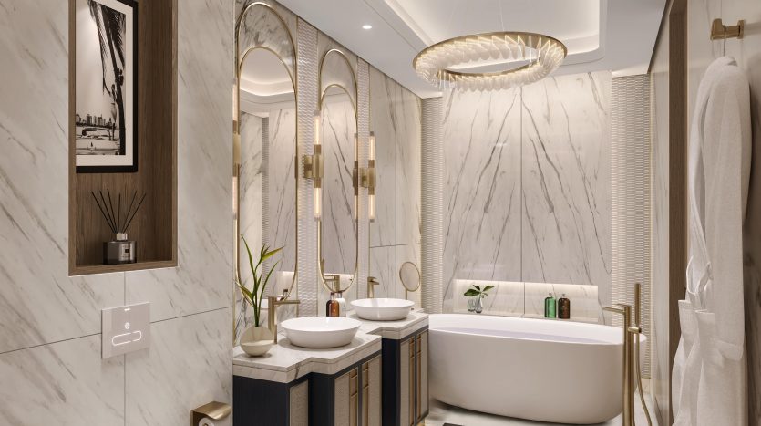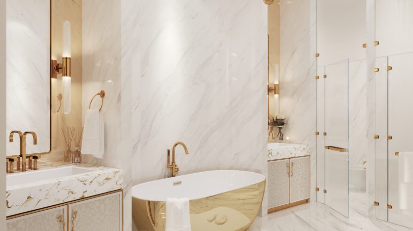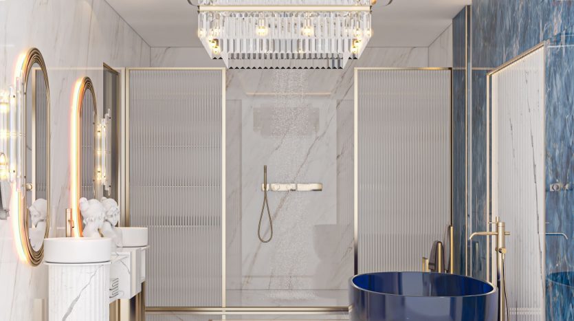 Luxurious Bathrooms: Quality fixtures, elegant tiling, rain showers, and standalone bathtubs.